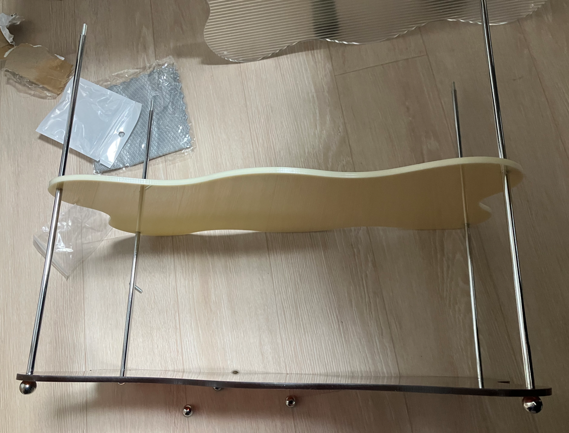 선반은 아크릴이고, 포장지가 잘 씌워져 오기 때문에 스크래치없이 매끈합니다.