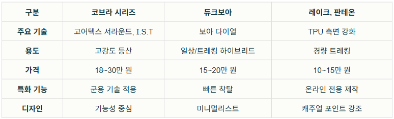 대표 등산화로는 코브라 시리즈가 있고 누적 판매량 100만 족 이상의 실적을 보여주며