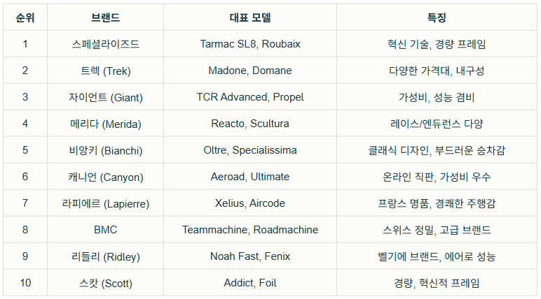 로드 자전거 브랜드 인기 순위 TOP10