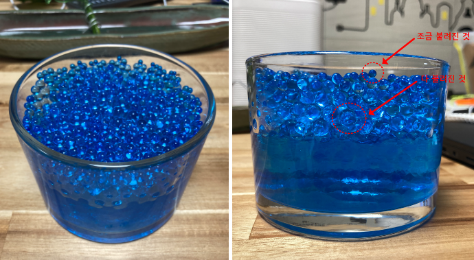 물에 닿으면 스펀지처럼 물을 마구 흡수해서 몇십 배로 부풀어 버리는데 반대로 또 주변이 건조하면 수분을 빼앗기면서 쪼그라들어 원래 형태로 되돌아 가는데 그게 재미있네요..