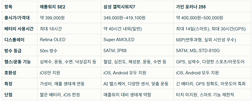애플워치 SE2와 다른 경쟁사 제품 비교