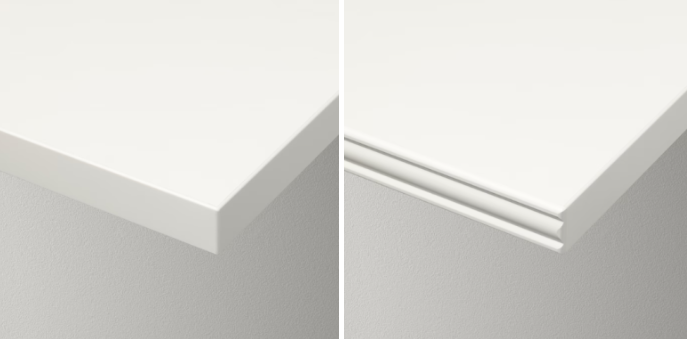 이케아 선반 라인업 중에 대표 사진으로 보여드린 제품은 베리스훌트라는 품명을 갖는데요, 요 제품의 재밌는 점은 이렇게 양쪽 면의 엣지 디자인이 각각 달라서 원하는 방향의 모서리 모양을 선택해서 각각 사용할 수 있는 점이에요.