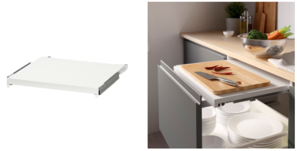 파티클보드, 라미네이트, 플라스틱 테두리 소재로 구성되어 있고 아연도금처리 된 레일로 되어 있어 주방에서의 습기로 인한 부식이나 손상은 걱정 없어 보입니다.
