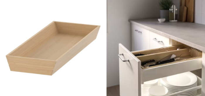 딱 보면 알 수 있는 수저 트레이인데요, 대나무 원목 소재로 제작하여 원목이 주는 자연스럽고 따뜻한 느낌이 있고 수저 및 조리도구 수납 정리에 딱 맞도록 깔끔한 파티션 처리까지 되어 있어 우리 집 서랍장에 딱 맞는 사이즈라면 바로 장바구니에 담고 싶게 마음에 들게 생겼어요.