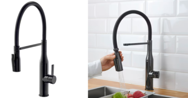 주방 수전인데 목이 자유로이 꺾이는 플렉시블 형태로 되어 있어 다용도로 편리하게 사용할 수 있어 보여요.