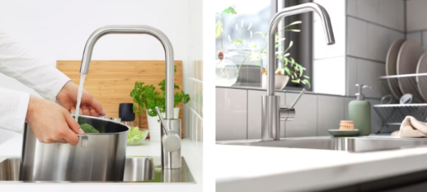 주방 수전인데 목이 자유로이 꺾이는 플렉시블 형태로 되어 있어 다용도로 편리하게 사용할 수 있어 보여요.