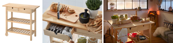 주방카트 겸 트롤리라고 할 수 있겠는데 자작나무 소재로 만들었고 이동이 편리하면서도 막 굴러다니지 않도록 한 쪽에만 리어카 마냥 바퀴가 달려 있어요.